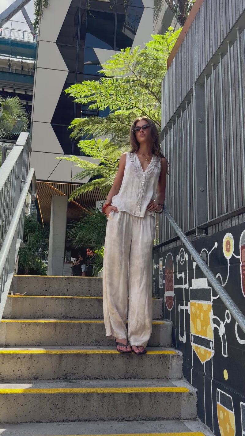 Crafted from lightweight viscose satin with subtle hand-crafted tie-dye, our newest Sienna pants have a relaxed, fluid fit.